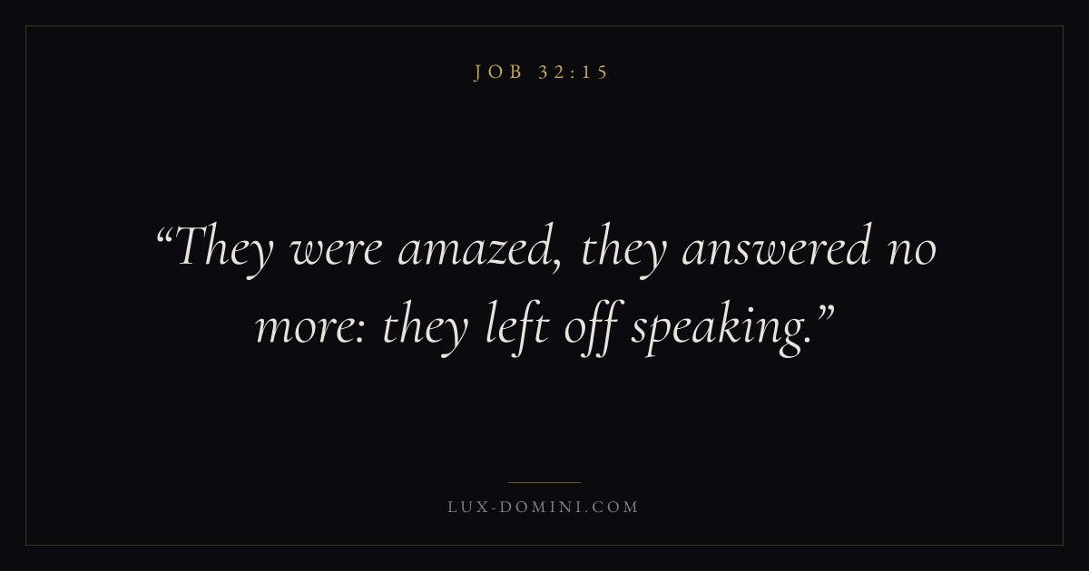 Books / Job / Chapter 32 / Verse 15 ← Job 32:14 Job 32:15 Job 32:16 → They were amazed, they answered no more: they left off speaking. Download verse card Share on Twitter Share on Facebook Pin it ✦ Key themes Suffering and trialsWisdomJustice and mercyPeaceSuffering Read with Job 32:16Job 32:17Romans 8:182 Corinthians 4:17 Related topics Bible verses about suffering and trialsBible verses about wisdomBible verses about justice and mercyBible verses about peace ✦ Job Chapter 32 verses V. 1 V. 2 V. 3 V. 4 V. 5 V. 6 V. 7 V. 8 V. 9 V. 10 V. 11 V. 12 V. 13 V. 14 V. 15 V. 16 V. 17 V. 18 V. 19 V. 20 V. 21 V. 22