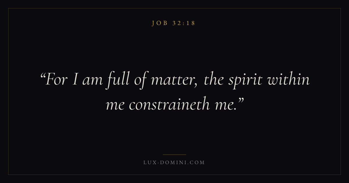 Books / Job / Chapter 32 / Verse 18 ← Job 32:17 Job 32:18 Job 32:19 → For I am full of matter, the spirit within me constraineth me. Download verse card Share on Twitter Share on Facebook Pin it ✦ Key themes Suffering and trialsWisdomJustice and mercyPeaceSuffering Read with Job 32:15Job 32:16Romans 8:182 Corinthians 4:17 Related topics Bible verses about suffering and trialsBible verses about wisdomBible verses about justice and mercyBible verses about peace ✦ Job Chapter 32 verses V. 1 V. 2 V. 3 V. 4 V. 5 V. 6 V. 7 V. 8 V. 9 V. 10 V. 11 V. 12 V. 13 V. 14 V. 15 V. 16 V. 17 V. 18 V. 19 V. 20 V. 21 V. 22