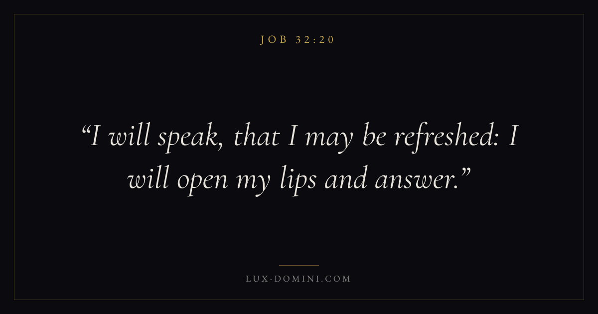Books / Job / Chapter 32 / Verse 20 ← Job 32:19 Job 32:20 Job 32:21 → I will speak, that I may be refreshed: I will open my lips and answer. Download verse card Share on Twitter Share on Facebook Pin it ✦ Key themes Suffering and trialsWisdomJustice and mercyPeaceSuffering Read with Job 32:19Romans 8:182 Corinthians 4:17Proverbs 1:7 Related topics Bible verses about suffering and trialsBible verses about wisdomBible verses about justice and mercyBible verses about peace ✦ Job Chapter 32 verses V. 1 V. 2 V. 3 V. 4 V. 5 V. 6 V. 7 V. 8 V. 9 V. 10 V. 11 V. 12 V. 13 V. 14 V. 15 V. 16 V. 17 V. 18 V. 19 V. 20 V. 21 V. 22