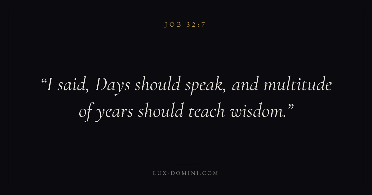 Books / Job / Chapter 32 / Verse 7 ← Job 32:6 Job 32:7 Job 32:8 → I said, Days should speak, and multitude of years should teach wisdom. Download verse card Share on Twitter Share on Facebook Pin it ✦ Key themes Suffering and trialsWisdomJustice and mercySuffering Read with Job 32:6Job 32:8Romans 8:182 Corinthians 4:17 Related topics Bible verses about suffering and trialsBible verses about wisdomBible verses about justice and mercy ✦ Job Chapter 32 verses V. 1 V. 2 V. 3 V. 4 V. 5 V. 6 V. 7 V. 8 V. 9 V. 10 V. 11 V. 12 V. 13 V. 14 V. 15 V. 16 V. 17 V. 18 V. 19 V. 20 V. 21 V. 22