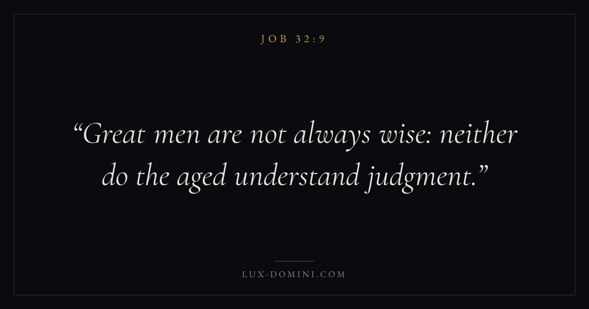 Books / Job / Chapter 32 / Verse 9 ← Job 32:8 Job 32:9 Job 32:10 → Great men are not always wise: neither do the aged understand judgment. Download verse card Share on Twitter Share on Facebook Pin it ✦ Key themes Suffering and trialsWisdomJustice and mercySuffering Read with Job 32:10Job 32:11Romans 8:182 Corinthians 4:17 Related topics Bible verses about suffering and trialsBible verses about wisdomBible verses about justice and mercy ✦ Job Chapter 32 verses V. 1 V. 2 V. 3 V. 4 V. 5 V. 6 V. 7 V. 8 V. 9 V. 10 V. 11 V. 12 V. 13 V. 14 V. 15 V. 16 V. 17 V. 18 V. 19 V. 20 V. 21 V. 22
