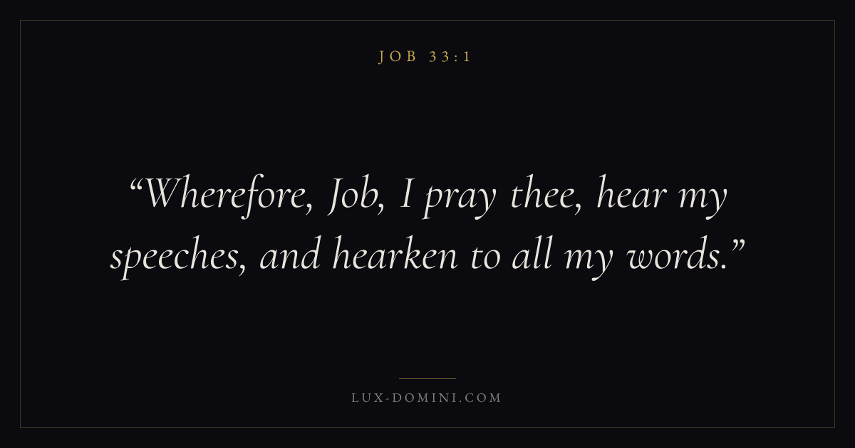 Books / Job / Chapter 33 / Verse 1 ← Job 32:22 Job 33:1 Job 33:2 → Wherefore, Job, I pray thee, hear my speeches, and hearken to all my words. Download verse card Share on Twitter Share on Facebook Pin it ✦ Key themes Suffering and trialsPrayerWisdomJustice and mercySuffering Read with Job 33:2Romans 8:182 Corinthians 4:17Matthew 6:9 Related topics Bible verses about suffering and trialsBible verses about prayerBible verses about wisdomBible verses about justice and mercy ✦ Job Chapter 33 verses V. 1 V. 2 V. 3 V. 4 V. 5 V. 6 V. 7 V. 8 V. 9 V. 10 V. 11 V. 12 V. 13 V. 14 V. 15 V. 16 V. 17 V. 18 V. 19 V. 20 V. 21 V. 22 V. 23 V. 24 V. 25 V. 26 V. 27 V. 28 V. 29 V. 30 V. 31 V. 32 V. 33