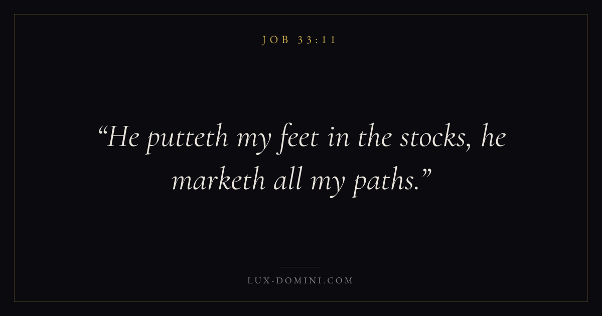 Books / Job / Chapter 33 / Verse 11 ← Job 33:10 Job 33:11 Job 33:12 → He putteth my feet in the stocks, he marketh all my paths. Download verse card Share on Twitter Share on Facebook Pin it ✦ Key themes Suffering and trialsWisdomJustice and mercyTruthSuffering Read with Job 33:10Romans 8:182 Corinthians 4:17Proverbs 1:7 Related topics Bible verses about suffering and trialsBible verses about wisdomBible verses about justice and mercyBible verses about truth ✦ Job Chapter 33 verses V. 1 V. 2 V. 3 V. 4 V. 5 V. 6 V. 7 V. 8 V. 9 V. 10 V. 11 V. 12 V. 13 V. 14 V. 15 V. 16 V. 17 V. 18 V. 19 V. 20 V. 21 V. 22 V. 23 V. 24 V. 25 V. 26 V. 27 V. 28 V. 29 V. 30 V. 31 V. 32 V. 33