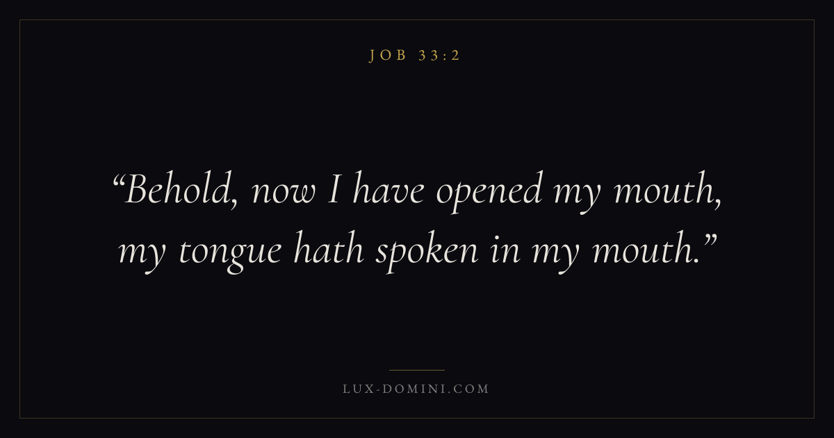 Books / Job / Chapter 33 / Verse 2 ← Job 33:1 Job 33:2 Job 33:3 → Behold, now I have opened my mouth, my tongue hath spoken in my mouth. Download verse card Share on Twitter Share on Facebook Pin it ✦ Key themes Suffering and trialsWisdomJustice and mercySuffering Read with Job 33:1Romans 8:182 Corinthians 4:17Proverbs 1:7 Related topics Bible verses about suffering and trialsBible verses about wisdomBible verses about justice and mercy ✦ Job Chapter 33 verses V. 1 V. 2 V. 3 V. 4 V. 5 V. 6 V. 7 V. 8 V. 9 V. 10 V. 11 V. 12 V. 13 V. 14 V. 15 V. 16 V. 17 V. 18 V. 19 V. 20 V. 21 V. 22 V. 23 V. 24 V. 25 V. 26 V. 27 V. 28 V. 29 V. 30 V. 31 V. 32 V. 33