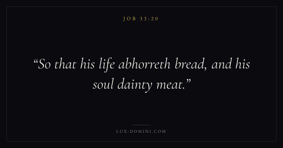 Books / Job / Chapter 33 / Verse 20 ← Job 33:19 Job 33:20 Job 33:21 → So that his life abhorreth bread, and his soul dainty meat. Download verse card Share on Twitter Share on Facebook Pin it ✦ Key themes Suffering and trialsWisdomJustice and mercySuffering Read with Job 33:19Romans 8:182 Corinthians 4:17Proverbs 1:7 Related topics Bible verses about suffering and trialsBible verses about wisdomBible verses about justice and mercy ✦ Job Chapter 33 verses V. 1 V. 2 V. 3 V. 4 V. 5 V. 6 V. 7 V. 8 V. 9 V. 10 V. 11 V. 12 V. 13 V. 14 V. 15 V. 16 V. 17 V. 18 V. 19 V. 20 V. 21 V. 22 V. 23 V. 24 V. 25 V. 26 V. 27 V. 28 V. 29 V. 30 V. 31 V. 32 V. 33