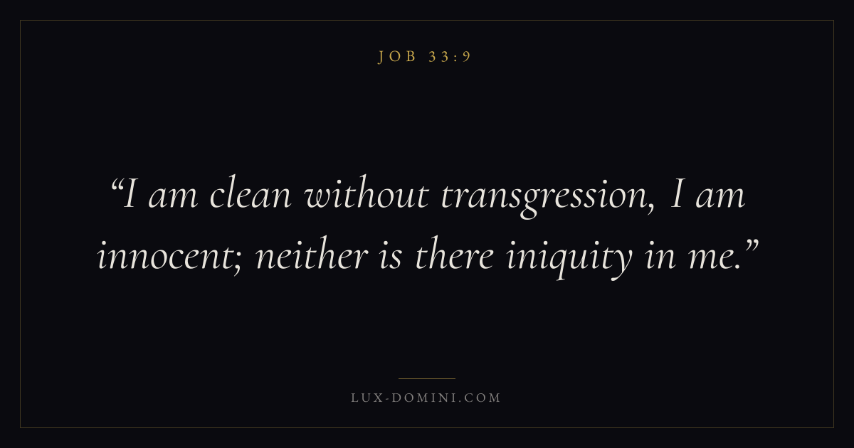 Books / Job / Chapter 33 / Verse 9 ← Job 33:8 Job 33:9 Job 33:10 → I am clean without transgression, I am innocent; neither is there iniquity in me. Download verse card Share on Twitter Share on Facebook Pin it ✦ Key themes Suffering and trialsWisdomJustice and mercyTruthSuffering Read with Job 33:8Romans 8:182 Corinthians 4:17Proverbs 1:7 Related topics Bible verses about suffering and trialsBible verses about wisdomBible verses about justice and mercyBible verses about truth ✦ Job Chapter 33 verses V. 1 V. 2 V. 3 V. 4 V. 5 V. 6 V. 7 V. 8 V. 9 V. 10 V. 11 V. 12 V. 13 V. 14 V. 15 V. 16 V. 17 V. 18 V. 19 V. 20 V. 21 V. 22 V. 23 V. 24 V. 25 V. 26 V. 27 V. 28 V. 29 V. 30 V. 31 V. 32 V. 33