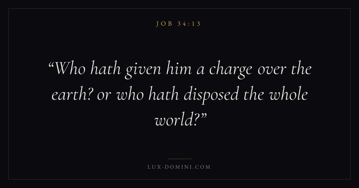 Books / Job / Chapter 34 / Verse 13 ← Job 34:12 Job 34:13 Job 34:14 → Who hath given him a charge over the earth? or who hath disposed the whole world? Download verse card Share on Twitter Share on Facebook Pin it ✦ Key themes Suffering and trialsWisdomJustice and mercySuffering Read with Job 34:12Romans 8:182 Corinthians 4:17Proverbs 1:7 Related topics Bible verses about suffering and trialsBible verses about wisdomBible verses about justice and mercy ✦ Job Chapter 34 verses V. 1 V. 2 V. 3 V. 4 V. 5 V. 6 V. 7 V. 8 V. 9 V. 10 V. 11 V. 12 V. 13 V. 14 V. 15 V. 16 V. 17 V. 18 V. 19 V. 20 V. 21 V. 22 V. 23 V. 24 V. 25 V. 26 V. 27 V. 28 V. 29 V. 30 V. 31 V. 32 V. 33 V. 34 V. 35 V. 36 V. 37