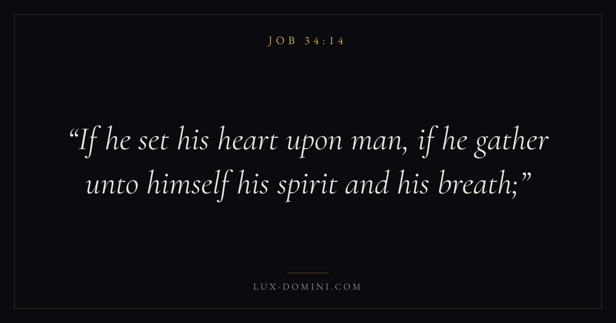 Books / Job / Chapter 34 / Verse 14 ← Job 34:13 Job 34:14 Job 34:15 → If he set his heart upon man, if he gather unto himself his spirit and his breath; Download verse card Share on Twitter Share on Facebook Pin it ✦ Key themes Suffering and trialsWisdomJustice and mercySuffering Read with Job 34:15Romans 8:182 Corinthians 4:17Proverbs 1:7 Related topics Bible verses about suffering and trialsBible verses about wisdomBible verses about justice and mercy ✦ Job Chapter 34 verses V. 1 V. 2 V. 3 V. 4 V. 5 V. 6 V. 7 V. 8 V. 9 V. 10 V. 11 V. 12 V. 13 V. 14 V. 15 V. 16 V. 17 V. 18 V. 19 V. 20 V. 21 V. 22 V. 23 V. 24 V. 25 V. 26 V. 27 V. 28 V. 29 V. 30 V. 31 V. 32 V. 33 V. 34 V. 35 V. 36 V. 37
