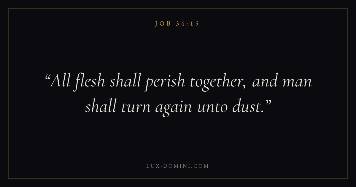 Books / Job / Chapter 34 / Verse 15 ← Job 34:14 Job 34:15 Job 34:16 → All flesh shall perish together, and man shall turn again unto dust. Download verse card Share on Twitter Share on Facebook Pin it ✦ Key themes Suffering and trialsWisdomJustice and mercySuffering Read with Job 34:14Romans 8:182 Corinthians 4:17Proverbs 1:7 Related topics Bible verses about suffering and trialsBible verses about wisdomBible verses about justice and mercy ✦ Job Chapter 34 verses V. 1 V. 2 V. 3 V. 4 V. 5 V. 6 V. 7 V. 8 V. 9 V. 10 V. 11 V. 12 V. 13 V. 14 V. 15 V. 16 V. 17 V. 18 V. 19 V. 20 V. 21 V. 22 V. 23 V. 24 V. 25 V. 26 V. 27 V. 28 V. 29 V. 30 V. 31 V. 32 V. 33 V. 34 V. 35 V. 36 V. 37