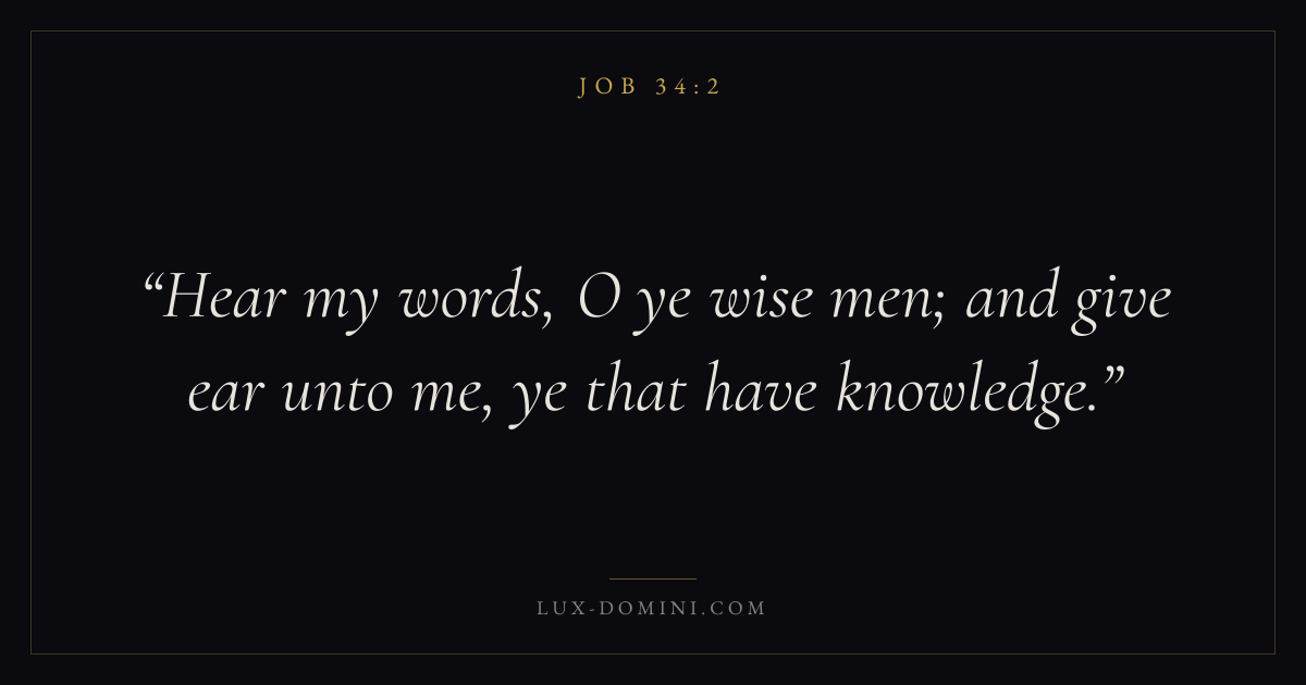 Books / Job / Chapter 34 / Verse 2 ← Job 34:1 Job 34:2 Job 34:3 → Hear my words, O ye wise men; and give ear unto me, ye that have knowledge. Download verse card Share on Twitter Share on Facebook Pin it ✦ Key themes Suffering and trialsWisdomJustice and mercyTruthSuffering Read with Job 34:1Job 34:3Romans 8:182 Corinthians 4:17 Related topics Bible verses about suffering and trialsBible verses about wisdomBible verses about justice and mercyBible verses about truth ✦ Job Chapter 34 verses V. 1 V. 2 V. 3 V. 4 V. 5 V. 6 V. 7 V. 8 V. 9 V. 10 V. 11 V. 12 V. 13 V. 14 V. 15 V. 16 V. 17 V. 18 V. 19 V. 20 V. 21 V. 22 V. 23 V. 24 V. 25 V. 26 V. 27 V. 28 V. 29 V. 30 V. 31 V. 32 V. 33 V. 34 V. 35 V. 36 V. 37