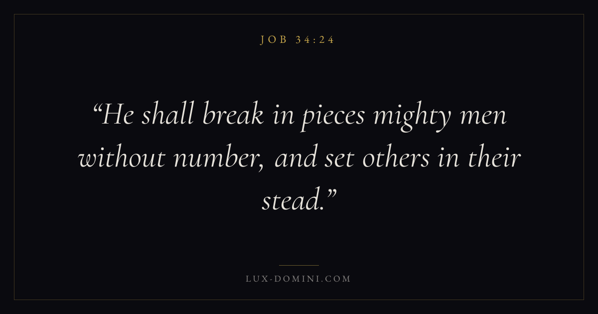 Books / Job / Chapter 34 / Verse 24 ← Job 34:23 Job 34:24 Job 34:25 → He shall break in pieces mighty men without number, and set others in their stead. Download verse card Share on Twitter Share on Facebook Pin it ✦ Key themes Suffering and trialsWisdomJustice and mercySuffering Read with Job 34:25Romans 8:182 Corinthians 4:17Proverbs 1:7 Related topics Bible verses about suffering and trialsBible verses about wisdomBible verses about justice and mercy ✦ Job Chapter 34 verses V. 1 V. 2 V. 3 V. 4 V. 5 V. 6 V. 7 V. 8 V. 9 V. 10 V. 11 V. 12 V. 13 V. 14 V. 15 V. 16 V. 17 V. 18 V. 19 V. 20 V. 21 V. 22 V. 23 V. 24 V. 25 V. 26 V. 27 V. 28 V. 29 V. 30 V. 31 V. 32 V. 33 V. 34 V. 35 V. 36 V. 37