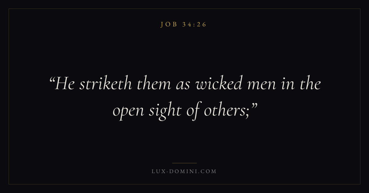Books / Job / Chapter 34 / Verse 26 ← Job 34:25 Job 34:26 Job 34:27 → He striketh them as wicked men in the open sight of others; Download verse card Share on Twitter Share on Facebook Pin it ✦ Key themes Suffering and trialsWisdomJustice and mercySuffering Read with Job 34:27Job 34:28Romans 8:182 Corinthians 4:17 Related topics Bible verses about suffering and trialsBible verses about wisdomBible verses about justice and mercy ✦ Job Chapter 34 verses V. 1 V. 2 V. 3 V. 4 V. 5 V. 6 V. 7 V. 8 V. 9 V. 10 V. 11 V. 12 V. 13 V. 14 V. 15 V. 16 V. 17 V. 18 V. 19 V. 20 V. 21 V. 22 V. 23 V. 24 V. 25 V. 26 V. 27 V. 28 V. 29 V. 30 V. 31 V. 32 V. 33 V. 34 V. 35 V. 36 V. 37