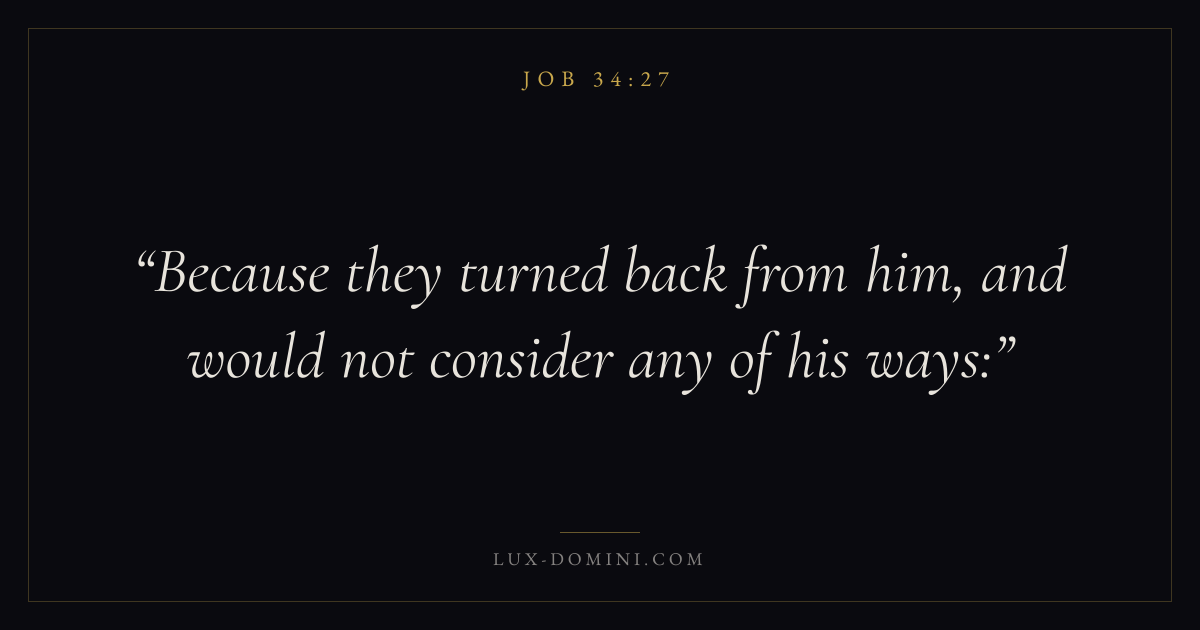 Books / Job / Chapter 34 / Verse 27 ← Job 34:26 Job 34:27 Job 34:28 → Because they turned back from him, and would not consider any of his ways: Download verse card Share on Twitter Share on Facebook Pin it ✦ Key themes Suffering and trialsWisdomJustice and mercySuffering Read with Job 34:26Job 34:28Romans 8:182 Corinthians 4:17 Related topics Bible verses about suffering and trialsBible verses about wisdomBible verses about justice and mercy ✦ Job Chapter 34 verses V. 1 V. 2 V. 3 V. 4 V. 5 V. 6 V. 7 V. 8 V. 9 V. 10 V. 11 V. 12 V. 13 V. 14 V. 15 V. 16 V. 17 V. 18 V. 19 V. 20 V. 21 V. 22 V. 23 V. 24 V. 25 V. 26 V. 27 V. 28 V. 29 V. 30 V. 31 V. 32 V. 33 V. 34 V. 35 V. 36 V. 37