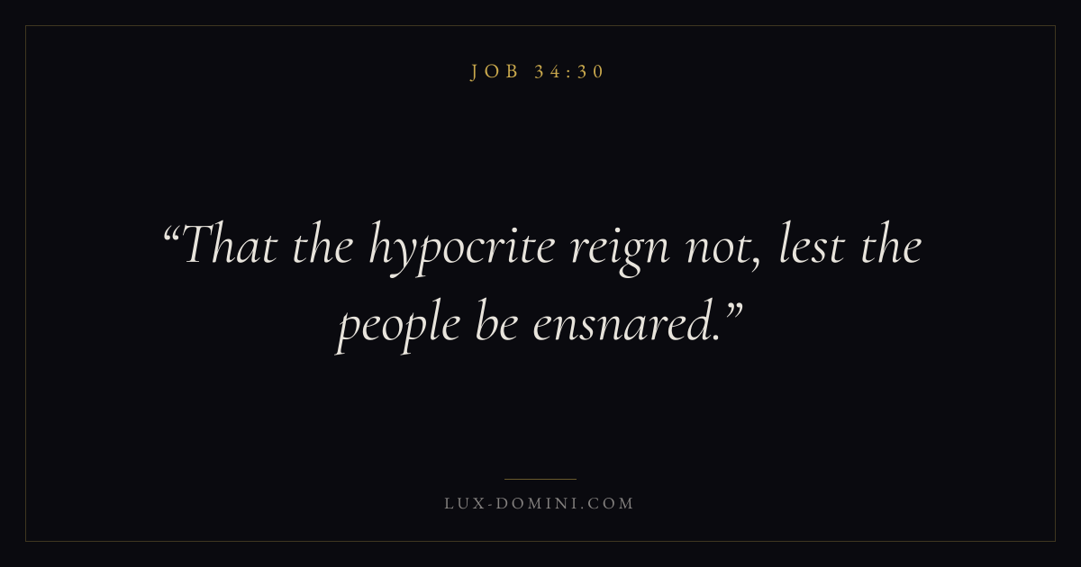 Books / Job / Chapter 34 / Verse 30 ← Job 34:29 Job 34:30 Job 34:31 → That the hypocrite reign not, lest the people be ensnared. Download verse card Share on Twitter Share on Facebook Pin it ✦ Key themes Suffering and trialsWisdomJustice and mercySuffering Read with Job 34:29Romans 8:182 Corinthians 4:17Proverbs 1:7 Related topics Bible verses about suffering and trialsBible verses about wisdomBible verses about justice and mercy ✦ Job Chapter 34 verses V. 1 V. 2 V. 3 V. 4 V. 5 V. 6 V. 7 V. 8 V. 9 V. 10 V. 11 V. 12 V. 13 V. 14 V. 15 V. 16 V. 17 V. 18 V. 19 V. 20 V. 21 V. 22 V. 23 V. 24 V. 25 V. 26 V. 27 V. 28 V. 29 V. 30 V. 31 V. 32 V. 33 V. 34 V. 35 V. 36 V. 37