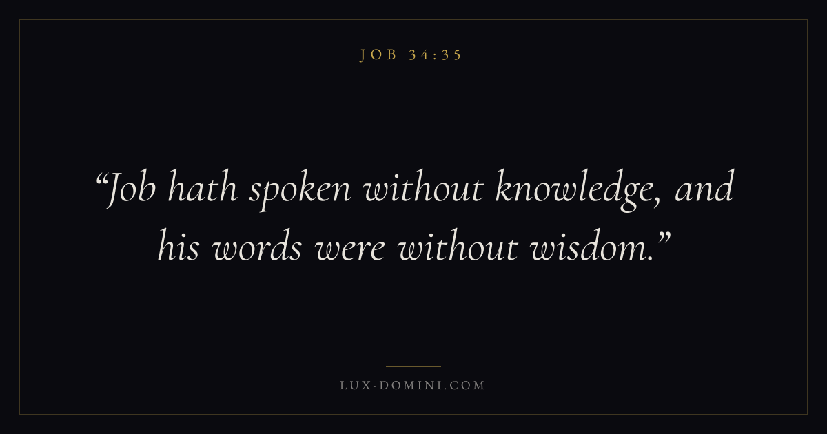 Books / Job / Chapter 34 / Verse 35 ← Job 34:34 Job 34:35 Job 34:36 → Job hath spoken without knowledge, and his words were without wisdom. Download verse card Share on Twitter Share on Facebook Pin it ✦ Key themes Suffering and trialsWisdomJustice and mercySuffering Read with Job 34:33Job 34:34Romans 8:182 Corinthians 4:17 Related topics Bible verses about suffering and trialsBible verses about wisdomBible verses about justice and mercy ✦ Job Chapter 34 verses V. 1 V. 2 V. 3 V. 4 V. 5 V. 6 V. 7 V. 8 V. 9 V. 10 V. 11 V. 12 V. 13 V. 14 V. 15 V. 16 V. 17 V. 18 V. 19 V. 20 V. 21 V. 22 V. 23 V. 24 V. 25 V. 26 V. 27 V. 28 V. 29 V. 30 V. 31 V. 32 V. 33 V. 34 V. 35 V. 36 V. 37