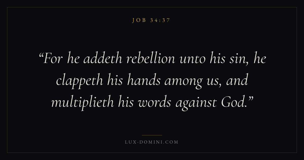 For he addeth rebellion unto his sin, he clappeth his hands among us, and multiplieth his words against God.