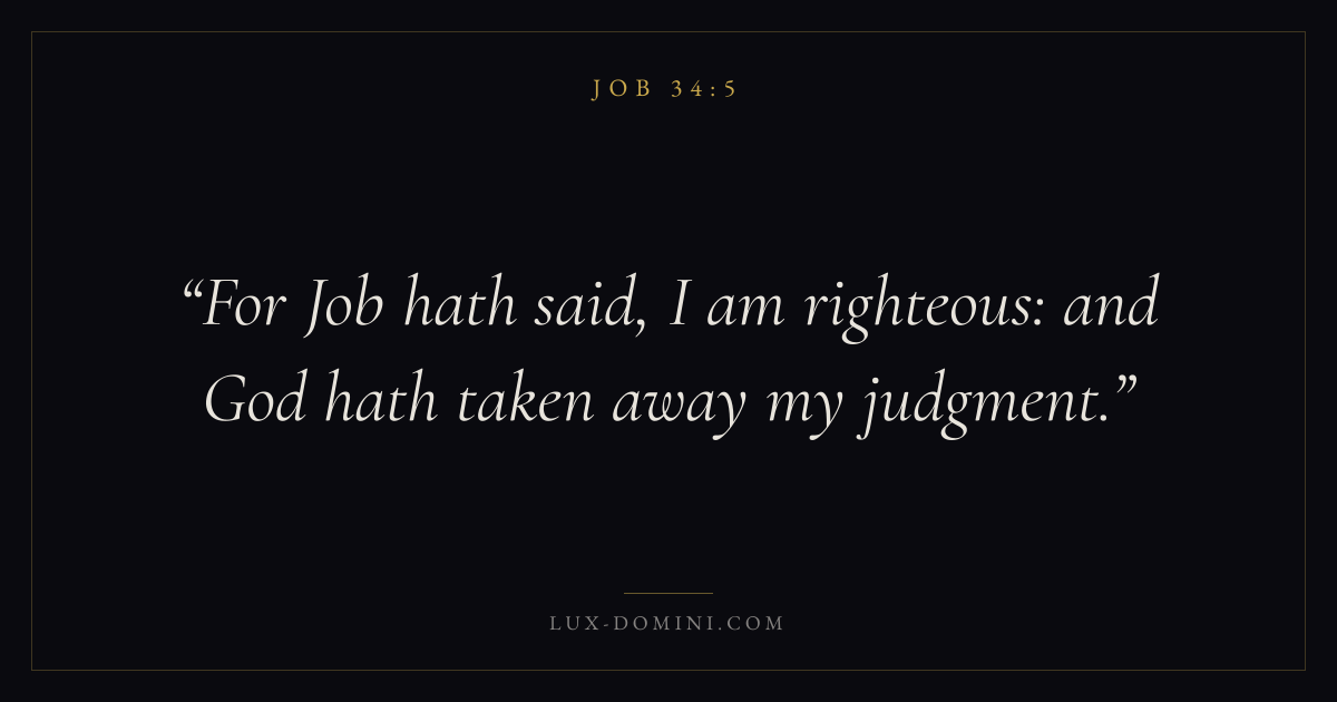 Books / Job / Chapter 34 / Verse 5 ← Job 34:4 Job 34:5 Job 34:6 → For Job hath said, I am righteous: and God hath taken away my judgment. Download verse card Share on Twitter Share on Facebook Pin it ✦ Key themes Suffering and trialsWisdomJustice and mercyTruthSuffering Read with Job 34:4Romans 8:182 Corinthians 4:17Proverbs 1:7 Related topics Bible verses about suffering and trialsBible verses about wisdomBible verses about justice and mercyBible verses about truth ✦ Job Chapter 34 verses V. 1 V. 2 V. 3 V. 4 V. 5 V. 6 V. 7 V. 8 V. 9 V. 10 V. 11 V. 12 V. 13 V. 14 V. 15 V. 16 V. 17 V. 18 V. 19 V. 20 V. 21 V. 22 V. 23 V. 24 V. 25 V. 26 V. 27 V. 28 V. 29 V. 30 V. 31 V. 32 V. 33 V. 34 V. 35 V. 36 V. 37