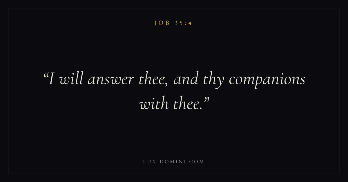 Books / Job / Chapter 35 / Verse 4 ← Job 35:3 Job 35:4 Job 35:5 → I will answer thee, and thy companions with thee. Download verse card Share on Twitter Share on Facebook Pin it ✦ Key themes Suffering and trialsWisdomJustice and mercySuffering Read with Job 35:5Romans 8:182 Corinthians 4:17Proverbs 1:7 Related topics Bible verses about suffering and trialsBible verses about wisdomBible verses about justice and mercy ✦ Job Chapter 35 verses V. 1 V. 2 V. 3 V. 4 V. 5 V. 6 V. 7 V. 8 V. 9 V. 10 V. 11 V. 12 V. 13 V. 14 V. 15 V. 16