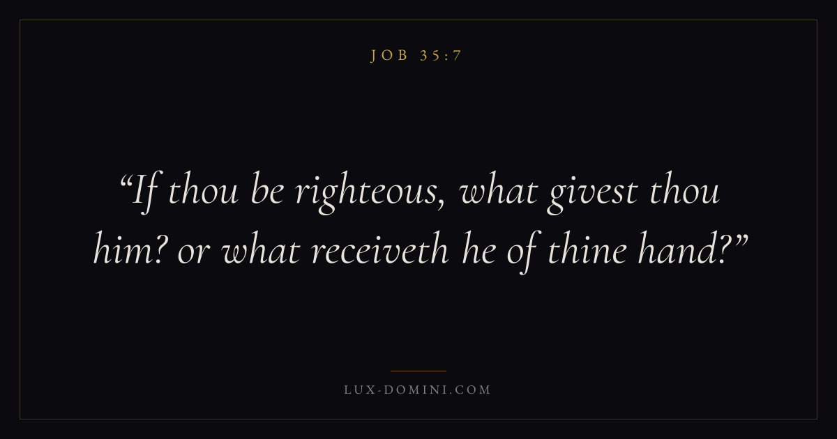Books / Job / Chapter 35 / Verse 7 ← Job 35:6 Job 35:7 Job 35:8 → If thou be righteous, what givest thou him? or what receiveth he of thine hand? Download verse card Share on Twitter Share on Facebook Pin it ✦ Key themes Suffering and trialsWisdomJustice and mercySuffering Read with Job 35:6Job 35:8Romans 8:182 Corinthians 4:17 Related topics Bible verses about suffering and trialsBible verses about wisdomBible verses about justice and mercy ✦ Job Chapter 35 verses V. 1 V. 2 V. 3 V. 4 V. 5 V. 6 V. 7 V. 8 V. 9 V. 10 V. 11 V. 12 V. 13 V. 14 V. 15 V. 16