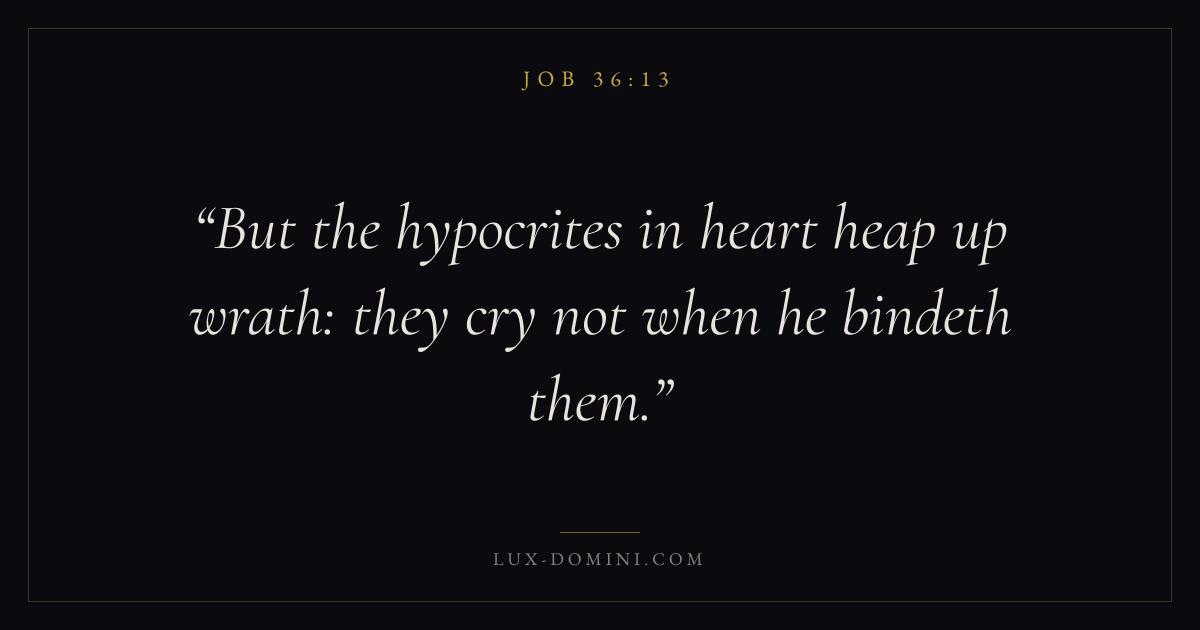 Books / Job / Chapter 36 / Verse 13 ← Job 36:12 Job 36:13 Job 36:14 → But the hypocrites in heart heap up wrath: they cry not when he bindeth them. Download verse card Share on Twitter Share on Facebook Pin it ✦ Key themes Suffering and trialsWisdomJustice and mercySuffering Read with Job 36:11Job 36:12Romans 8:182 Corinthians 4:17 Related topics Bible verses about suffering and trialsBible verses about wisdomBible verses about justice and mercy ✦ Job Chapter 36 verses V. 1 V. 2 V. 3 V. 4 V. 5 V. 6 V. 7 V. 8 V. 9 V. 10 V. 11 V. 12 V. 13 V. 14 V. 15 V. 16 V. 17 V. 18 V. 19 V. 20 V. 21 V. 22 V. 23 V. 24 V. 25 V. 26 V. 27 V. 28 V. 29 V. 30 V. 31 V. 32 V. 33