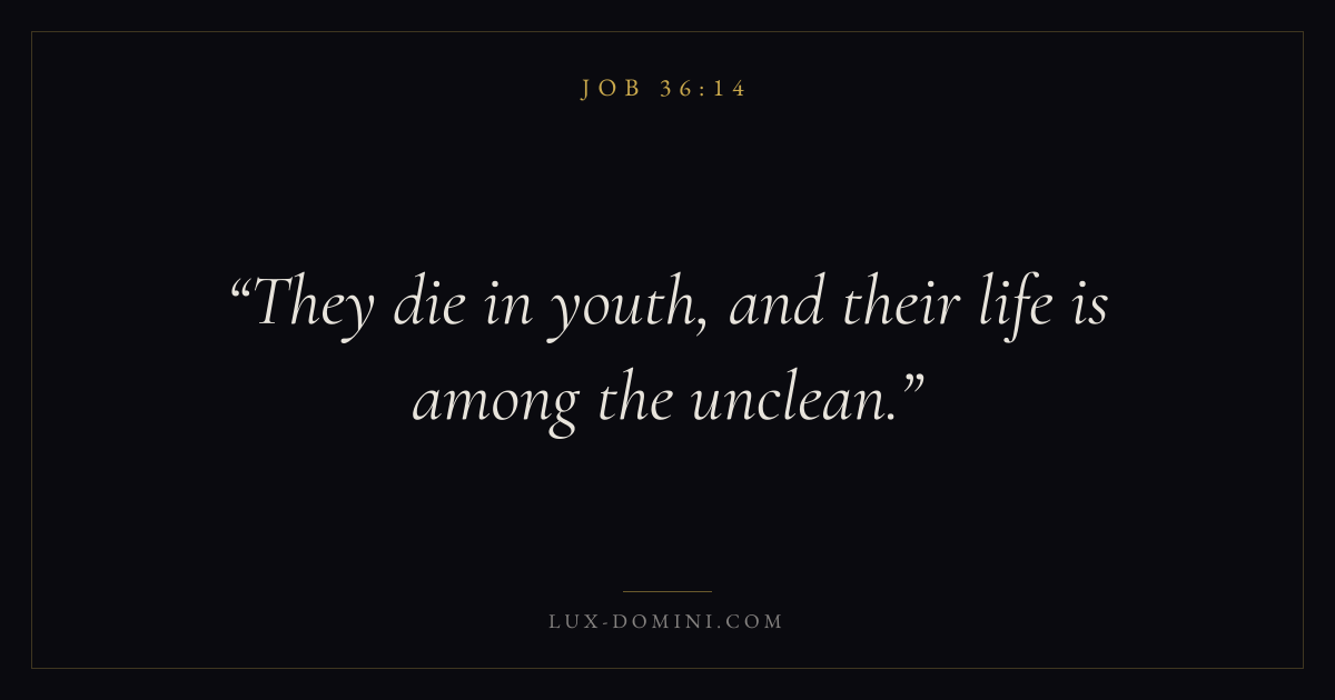Books / Job / Chapter 36 / Verse 14 ← Job 36:13 Job 36:14 Job 36:15 → They die in youth, and their life is among the unclean. Download verse card Share on Twitter Share on Facebook Pin it ✦ Key themes Suffering and trialsWisdomJustice and mercySuffering Read with Job 36:11Job 36:12Romans 8:182 Corinthians 4:17 Related topics Bible verses about suffering and trialsBible verses about wisdomBible verses about justice and mercy ✦ Job Chapter 36 verses V. 1 V. 2 V. 3 V. 4 V. 5 V. 6 V. 7 V. 8 V. 9 V. 10 V. 11 V. 12 V. 13 V. 14 V. 15 V. 16 V. 17 V. 18 V. 19 V. 20 V. 21 V. 22 V. 23 V. 24 V. 25 V. 26 V. 27 V. 28 V. 29 V. 30 V. 31 V. 32 V. 33
