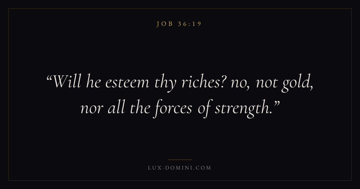 Books / Job / Chapter 36 / Verse 19 ← Job 36:18 Job 36:19 Job 36:20 → Will he esteem thy riches? no, not gold, nor all the forces of strength. Download verse card Share on Twitter Share on Facebook Pin it ✦ Key themes Suffering and trialsWisdomJustice and mercySuffering Read with Job 36:18Romans 8:182 Corinthians 4:17Proverbs 1:7 Related topics Bible verses about suffering and trialsBible verses about wisdomBible verses about justice and mercy ✦ Job Chapter 36 verses V. 1 V. 2 V. 3 V. 4 V. 5 V. 6 V. 7 V. 8 V. 9 V. 10 V. 11 V. 12 V. 13 V. 14 V. 15 V. 16 V. 17 V. 18 V. 19 V. 20 V. 21 V. 22 V. 23 V. 24 V. 25 V. 26 V. 27 V. 28 V. 29 V. 30 V. 31 V. 32 V. 33