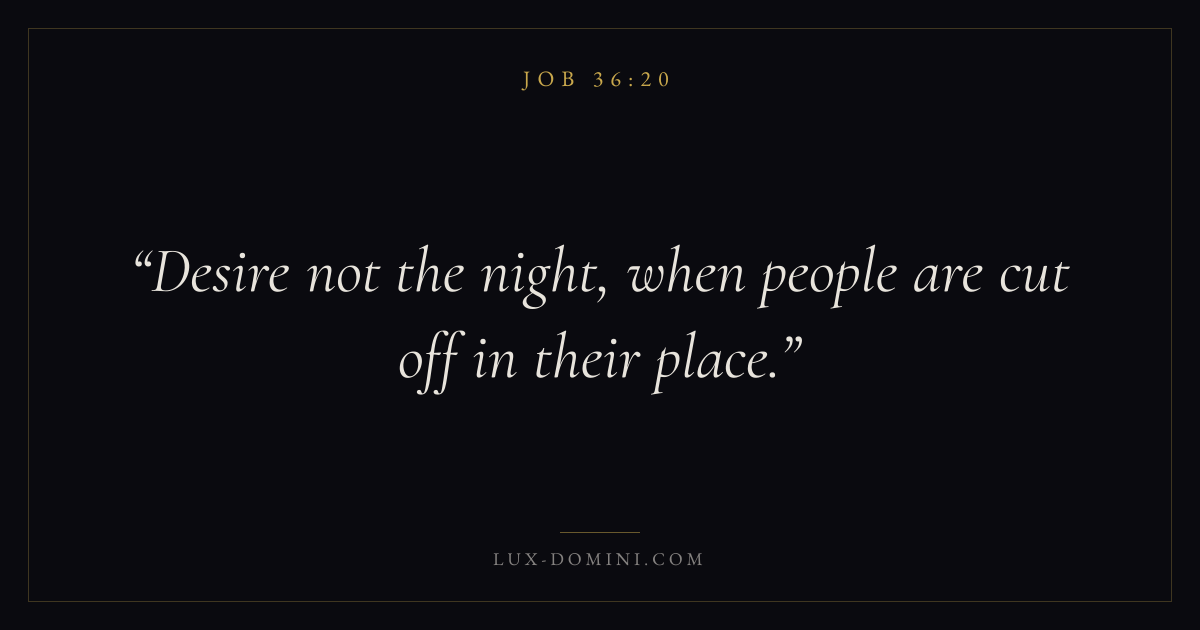 Books / Job / Chapter 36 / Verse 20 ← Job 36:19 Job 36:20 Job 36:21 → Desire not the night, when people are cut off in their place. Download verse card Share on Twitter Share on Facebook Pin it ✦ Key themes Suffering and trialsWisdomJustice and mercySuffering Read with Job 36:21Romans 8:182 Corinthians 4:17Proverbs 1:7 Related topics Bible verses about suffering and trialsBible verses about wisdomBible verses about justice and mercy ✦ Job Chapter 36 verses V. 1 V. 2 V. 3 V. 4 V. 5 V. 6 V. 7 V. 8 V. 9 V. 10 V. 11 V. 12 V. 13 V. 14 V. 15 V. 16 V. 17 V. 18 V. 19 V. 20 V. 21 V. 22 V. 23 V. 24 V. 25 V. 26 V. 27 V. 28 V. 29 V. 30 V. 31 V. 32 V. 33