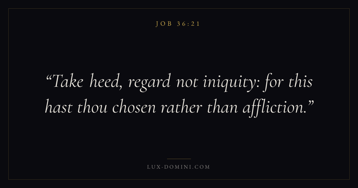 Books / Job / Chapter 36 / Verse 21 ← Job 36:20 Job 36:21 Job 36:22 → Take heed, regard not iniquity: for this hast thou chosen rather than affliction. Download verse card Share on Twitter Share on Facebook Pin it ✦ Key themes Suffering and trialsWisdomJustice and mercySuffering Read with Job 36:20Romans 8:182 Corinthians 4:17Proverbs 1:7 Related topics Bible verses about suffering and trialsBible verses about wisdomBible verses about justice and mercy ✦ Job Chapter 36 verses V. 1 V. 2 V. 3 V. 4 V. 5 V. 6 V. 7 V. 8 V. 9 V. 10 V. 11 V. 12 V. 13 V. 14 V. 15 V. 16 V. 17 V. 18 V. 19 V. 20 V. 21 V. 22 V. 23 V. 24 V. 25 V. 26 V. 27 V. 28 V. 29 V. 30 V. 31 V. 32 V. 33