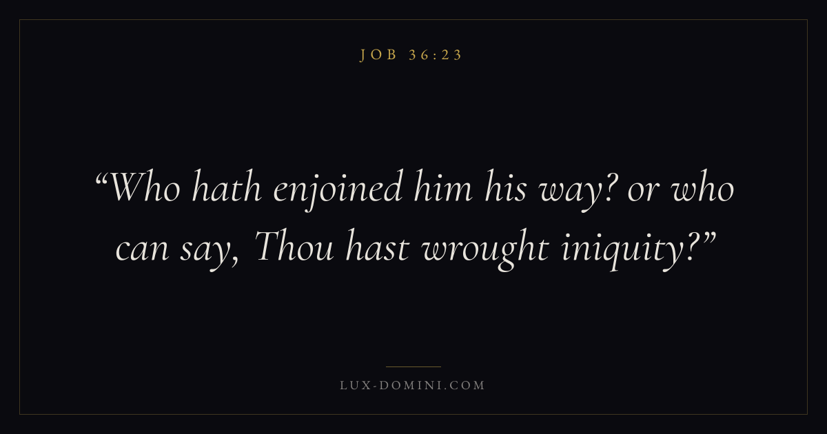 Books / Job / Chapter 36 / Verse 23 ← Job 36:22 Job 36:23 Job 36:24 → Who hath enjoined him his way? or who can say, Thou hast wrought iniquity? Download verse card Share on Twitter Share on Facebook Pin it ✦ Key themes Suffering and trialsWisdomJustice and mercySuffering Read with Job 36:22Romans 8:182 Corinthians 4:17Proverbs 1:7 Related topics Bible verses about suffering and trialsBible verses about wisdomBible verses about justice and mercy ✦ Job Chapter 36 verses V. 1 V. 2 V. 3 V. 4 V. 5 V. 6 V. 7 V. 8 V. 9 V. 10 V. 11 V. 12 V. 13 V. 14 V. 15 V. 16 V. 17 V. 18 V. 19 V. 20 V. 21 V. 22 V. 23 V. 24 V. 25 V. 26 V. 27 V. 28 V. 29 V. 30 V. 31 V. 32 V. 33