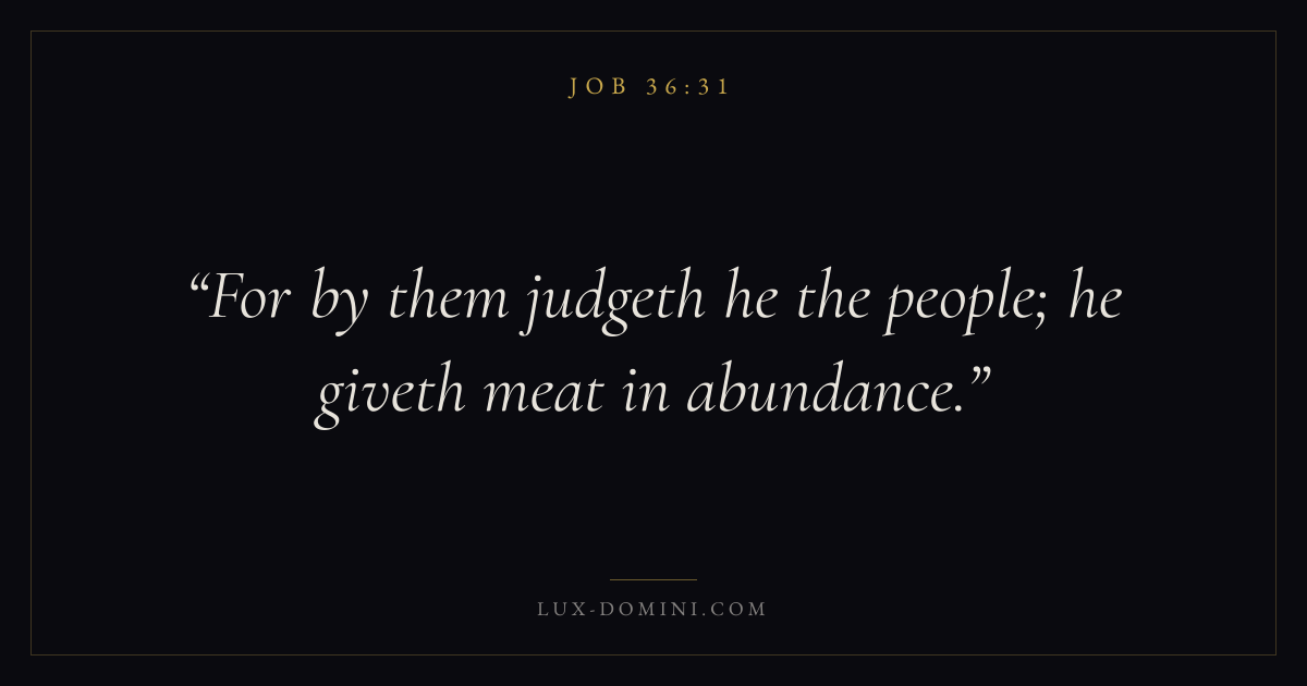 Books / Job / Chapter 36 / Verse 31 ← Job 36:30 Job 36:31 Job 36:32 → For by them judgeth he the people; he giveth meat in abundance. Download verse card Share on Twitter Share on Facebook Pin it ✦ Key themes Suffering and trialsWisdomJustice and mercySuffering Read with Job 36:29Job 36:30Romans 8:182 Corinthians 4:17 Related topics Bible verses about suffering and trialsBible verses about wisdomBible verses about justice and mercy ✦ Job Chapter 36 verses V. 1 V. 2 V. 3 V. 4 V. 5 V. 6 V. 7 V. 8 V. 9 V. 10 V. 11 V. 12 V. 13 V. 14 V. 15 V. 16 V. 17 V. 18 V. 19 V. 20 V. 21 V. 22 V. 23 V. 24 V. 25 V. 26 V. 27 V. 28 V. 29 V. 30 V. 31 V. 32 V. 33