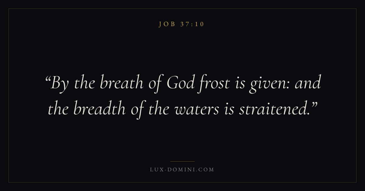 Books / Job / Chapter 37 / Verse 10 ← Job 37:9 Job 37:10 Job 37:11 → By the breath of God frost is given: and the breadth of the waters is straitened. Download verse card Share on Twitter Share on Facebook Pin it ✦ Key themes Suffering and trialsWisdomJustice and mercySuffering Read with Job 37:9Romans 8:182 Corinthians 4:17Proverbs 1:7 Related topics Bible verses about suffering and trialsBible verses about wisdomBible verses about justice and mercy ✦ Job Chapter 37 verses V. 1 V. 2 V. 3 V. 4 V. 5 V. 6 V. 7 V. 8 V. 9 V. 10 V. 11 V. 12 V. 13 V. 14 V. 15 V. 16 V. 17 V. 18 V. 19 V. 20 V. 21 V. 22 V. 23 V. 24