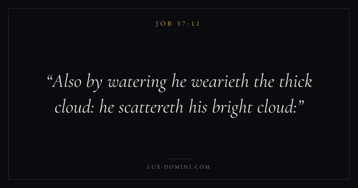 Books / Job / Chapter 37 / Verse 11 ← Job 37:10 Job 37:11 Job 37:12 → Also by watering he wearieth the thick cloud: he scattereth his bright cloud: Download verse card Share on Twitter Share on Facebook Pin it ✦ Key themes Suffering and trialsWisdomJustice and mercySuffering Read with Job 37:12Job 37:13Romans 8:182 Corinthians 4:17 Related topics Bible verses about suffering and trialsBible verses about wisdomBible verses about justice and mercy ✦ Job Chapter 37 verses V. 1 V. 2 V. 3 V. 4 V. 5 V. 6 V. 7 V. 8 V. 9 V. 10 V. 11 V. 12 V. 13 V. 14 V. 15 V. 16 V. 17 V. 18 V. 19 V. 20 V. 21 V. 22 V. 23 V. 24