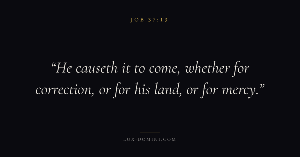 Books / Job / Chapter 37 / Verse 13 ← Job 37:12 Job 37:13 Job 37:14 → He causeth it to come, whether for correction, or for his land, or for mercy. Download verse card Share on Twitter Share on Facebook Pin it ✦ Key themes Suffering and trialsWisdomJustice and mercySuffering Read with Job 37:11Job 37:12Romans 8:182 Corinthians 4:17 Related topics Bible verses about suffering and trialsBible verses about wisdomBible verses about justice and mercy ✦ Job Chapter 37 verses V. 1 V. 2 V. 3 V. 4 V. 5 V. 6 V. 7 V. 8 V. 9 V. 10 V. 11 V. 12 V. 13 V. 14 V. 15 V. 16 V. 17 V. 18 V. 19 V. 20 V. 21 V. 22 V. 23 V. 24
