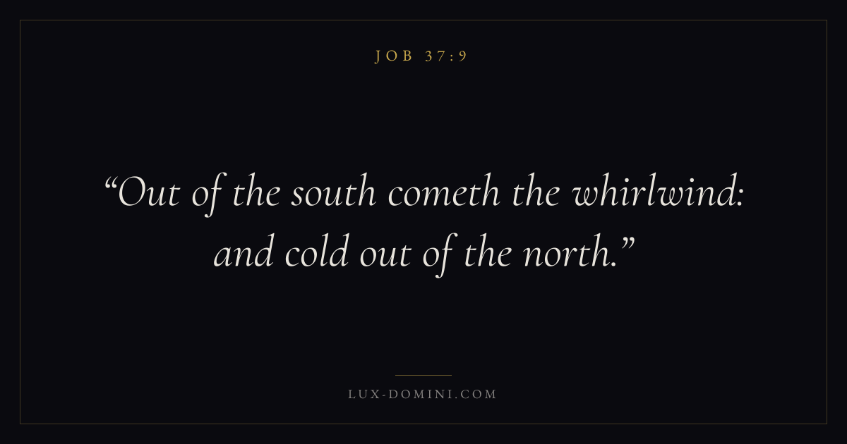 Books / Job / Chapter 37 / Verse 9 ← Job 37:8 Job 37:9 Job 37:10 → Out of the south cometh the whirlwind: and cold out of the north. Download verse card Share on Twitter Share on Facebook Pin it ✦ Key themes Suffering and trialsWisdomJustice and mercySuffering Read with Job 37:10Romans 8:182 Corinthians 4:17Proverbs 1:7 Related topics Bible verses about suffering and trialsBible verses about wisdomBible verses about justice and mercy ✦ Job Chapter 37 verses V. 1 V. 2 V. 3 V. 4 V. 5 V. 6 V. 7 V. 8 V. 9 V. 10 V. 11 V. 12 V. 13 V. 14 V. 15 V. 16 V. 17 V. 18 V. 19 V. 20 V. 21 V. 22 V. 23 V. 24
