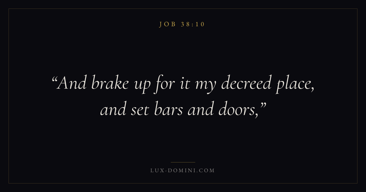 Books / Job / Chapter 38 / Verse 10 ← Job 38:9 Job 38:10 Job 38:11 → And brake up for it my decreed place, and set bars and doors, Download verse card Share on Twitter Share on Facebook Pin it ✦ Key themes Anxiety and fearSuffering and trialsWisdomJustice and mercySuffering Read with Job 38:9Job 38:11Philippians 4:6Isaiah 41:10 Related topics Bible verses about anxiety and fearBible verses about suffering and trialsBible verses about wisdomBible verses about justice and mercy ✦ Job Chapter 38 verses V. 1 V. 2 V. 3 V. 4 V. 5 V. 6 V. 7 V. 8 V. 9 V. 10 V. 11 V. 12 V. 13 V. 14 V. 15 V. 16 V. 17 V. 18 V. 19 V. 20 V. 21 V. 22 V. 23 V. 24 V. 25 V. 26 V. 27 V. 28 V. 29 V. 30 V. 31 V. 32 V. 33 V. 34 V. 35 V. 36 V. 37 V. 38 V. 39 V. 40 V. 41