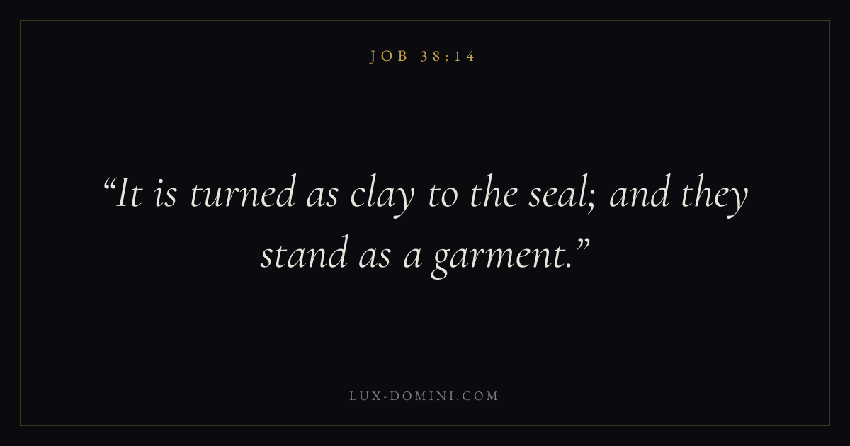 Books / Job / Chapter 38 / Verse 14 ← Job 38:13 Job 38:14 Job 38:15 → It is turned as clay to the seal; and they stand as a garment. Download verse card Share on Twitter Share on Facebook Pin it ✦ Key themes Suffering and trialsWisdomJustice and mercySuffering Read with Job 38:15Romans 8:182 Corinthians 4:17Proverbs 1:7 Related topics Bible verses about suffering and trialsBible verses about wisdomBible verses about justice and mercy ✦ Job Chapter 38 verses V. 1 V. 2 V. 3 V. 4 V. 5 V. 6 V. 7 V. 8 V. 9 V. 10 V. 11 V. 12 V. 13 V. 14 V. 15 V. 16 V. 17 V. 18 V. 19 V. 20 V. 21 V. 22 V. 23 V. 24 V. 25 V. 26 V. 27 V. 28 V. 29 V. 30 V. 31 V. 32 V. 33 V. 34 V. 35 V. 36 V. 37 V. 38 V. 39 V. 40 V. 41