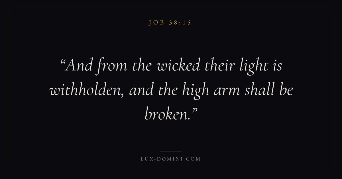 Books / Job / Chapter 38 / Verse 15 ← Job 38:14 Job 38:15 Job 38:16 → And from the wicked their light is withholden, and the high arm shall be broken. Download verse card Share on Twitter Share on Facebook Pin it ✦ Key themes Suffering and trialsWisdomJustice and mercySuffering Read with Job 38:14Romans 8:182 Corinthians 4:17Proverbs 1:7 Related topics Bible verses about suffering and trialsBible verses about wisdomBible verses about justice and mercy ✦ Job Chapter 38 verses V. 1 V. 2 V. 3 V. 4 V. 5 V. 6 V. 7 V. 8 V. 9 V. 10 V. 11 V. 12 V. 13 V. 14 V. 15 V. 16 V. 17 V. 18 V. 19 V. 20 V. 21 V. 22 V. 23 V. 24 V. 25 V. 26 V. 27 V. 28 V. 29 V. 30 V. 31 V. 32 V. 33 V. 34 V. 35 V. 36 V. 37 V. 38 V. 39 V. 40 V. 41