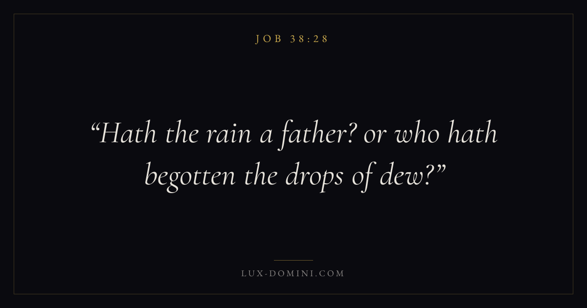 Books / Job / Chapter 38 / Verse 28 ← Job 38:27 Job 38:28 Job 38:29 → Hath the rain a father? or who hath begotten the drops of dew? Download verse card Share on Twitter Share on Facebook Pin it ✦ Key themes Suffering and trialsWisdomJustice and mercySuffering Read with Job 38:29Romans 8:182 Corinthians 4:17Proverbs 1:7 Related topics Bible verses about suffering and trialsBible verses about wisdomBible verses about justice and mercy ✦ Job Chapter 38 verses V. 1 V. 2 V. 3 V. 4 V. 5 V. 6 V. 7 V. 8 V. 9 V. 10 V. 11 V. 12 V. 13 V. 14 V. 15 V. 16 V. 17 V. 18 V. 19 V. 20 V. 21 V. 22 V. 23 V. 24 V. 25 V. 26 V. 27 V. 28 V. 29 V. 30 V. 31 V. 32 V. 33 V. 34 V. 35 V. 36 V. 37 V. 38 V. 39 V. 40 V. 41