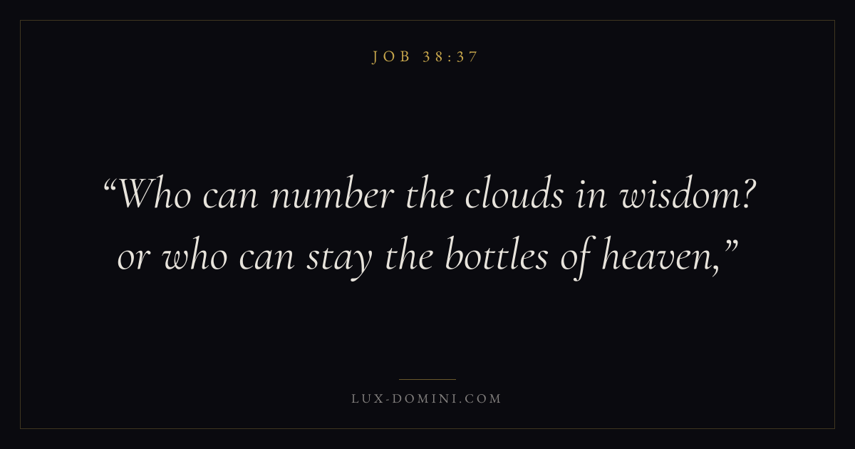 Books / Job / Chapter 38 / Verse 37 ← Job 38:36 Job 38:37 Job 38:38 → Who can number the clouds in wisdom? or who can stay the bottles of heaven, Download verse card Share on Twitter Share on Facebook Pin it ✦ Key themes Suffering and trialsWisdomJustice and mercySuffering Read with Job 38:38Romans 8:182 Corinthians 4:17Proverbs 1:7 Related topics Bible verses about suffering and trialsBible verses about wisdomBible verses about justice and mercy ✦ Job Chapter 38 verses V. 1 V. 2 V. 3 V. 4 V. 5 V. 6 V. 7 V. 8 V. 9 V. 10 V. 11 V. 12 V. 13 V. 14 V. 15 V. 16 V. 17 V. 18 V. 19 V. 20 V. 21 V. 22 V. 23 V. 24 V. 25 V. 26 V. 27 V. 28 V. 29 V. 30 V. 31 V. 32 V. 33 V. 34 V. 35 V. 36 V. 37 V. 38 V. 39 V. 40 V. 41