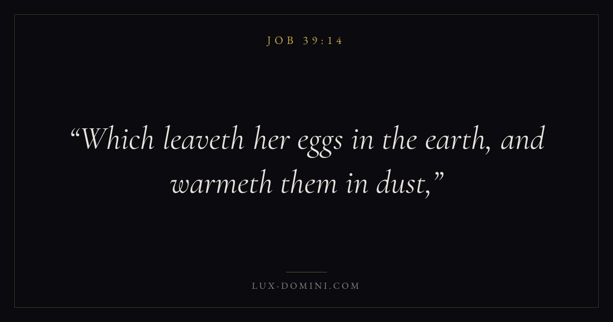 Books / Job / Chapter 39 / Verse 14 ← Job 39:13 Job 39:14 Job 39:15 → Which leaveth her eggs in the earth, and warmeth them in dust, Download verse card Share on Twitter Share on Facebook Pin it ✦ Key themes Suffering and trialsWisdomJustice and mercySuffering Read with Job 39:13Job 39:15Romans 8:182 Corinthians 4:17 Related topics Bible verses about suffering and trialsBible verses about wisdomBible verses about justice and mercy ✦ Job Chapter 39 verses V. 1 V. 2 V. 3 V. 4 V. 5 V. 6 V. 7 V. 8 V. 9 V. 10 V. 11 V. 12 V. 13 V. 14 V. 15 V. 16 V. 17 V. 18 V. 19 V. 20 V. 21 V. 22 V. 23 V. 24 V. 25 V. 26 V. 27 V. 28 V. 29 V. 30