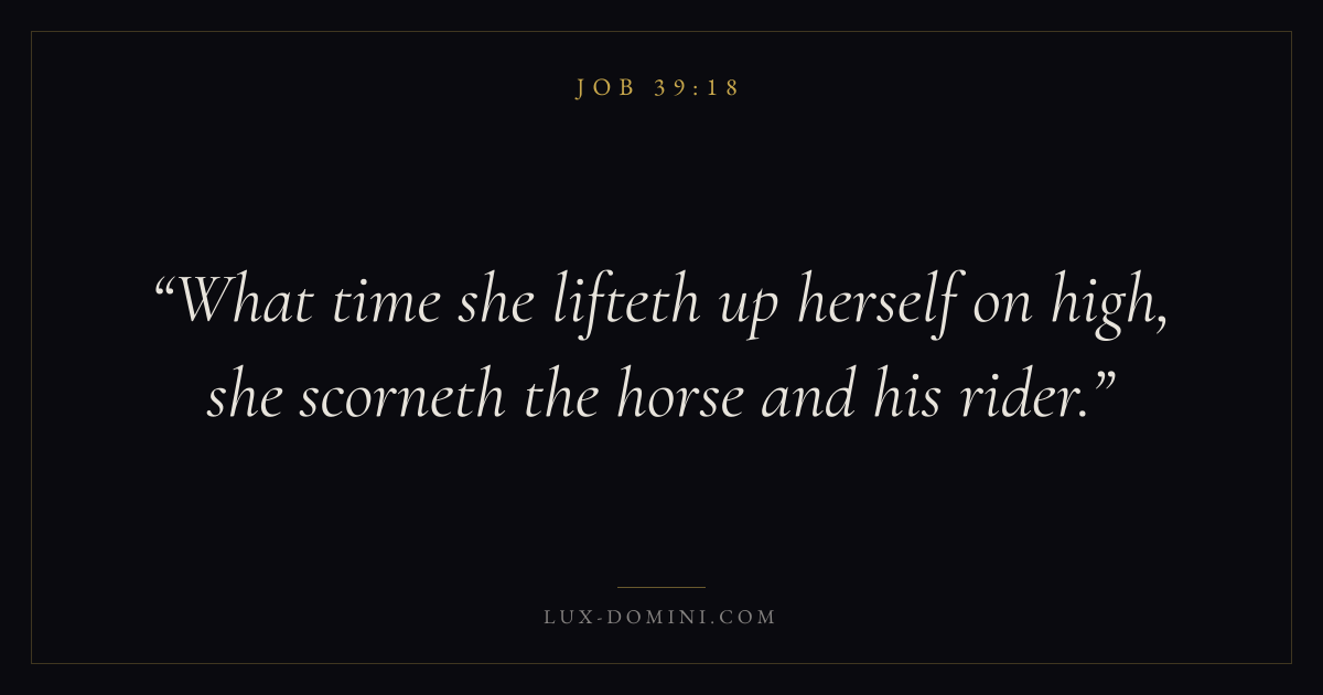 Books / Job / Chapter 39 / Verse 18 ← Job 39:17 Job 39:18 Job 39:19 → What time she lifteth up herself on high, she scorneth the horse and his rider. Download verse card Share on Twitter Share on Facebook Pin it ✦ Key themes Suffering and trialsWisdomJustice and mercySuffering Read with Job 39:16Job 39:17Romans 8:182 Corinthians 4:17 Related topics Bible verses about suffering and trialsBible verses about wisdomBible verses about justice and mercy ✦ Job Chapter 39 verses V. 1 V. 2 V. 3 V. 4 V. 5 V. 6 V. 7 V. 8 V. 9 V. 10 V. 11 V. 12 V. 13 V. 14 V. 15 V. 16 V. 17 V. 18 V. 19 V. 20 V. 21 V. 22 V. 23 V. 24 V. 25 V. 26 V. 27 V. 28 V. 29 V. 30