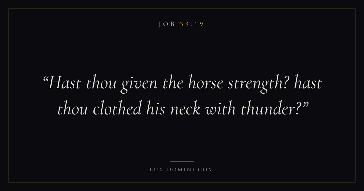 Books / Job / Chapter 39 / Verse 19 ← Job 39:18 Job 39:19 Job 39:20 → Hast thou given the horse strength? hast thou clothed his neck with thunder? Download verse card Share on Twitter Share on Facebook Pin it ✦ Key themes Suffering and trialsWisdomJustice and mercySuffering Read with Job 39:20Romans 8:182 Corinthians 4:17Proverbs 1:7 Related topics Bible verses about suffering and trialsBible verses about wisdomBible verses about justice and mercy ✦ Job Chapter 39 verses V. 1 V. 2 V. 3 V. 4 V. 5 V. 6 V. 7 V. 8 V. 9 V. 10 V. 11 V. 12 V. 13 V. 14 V. 15 V. 16 V. 17 V. 18 V. 19 V. 20 V. 21 V. 22 V. 23 V. 24 V. 25 V. 26 V. 27 V. 28 V. 29 V. 30