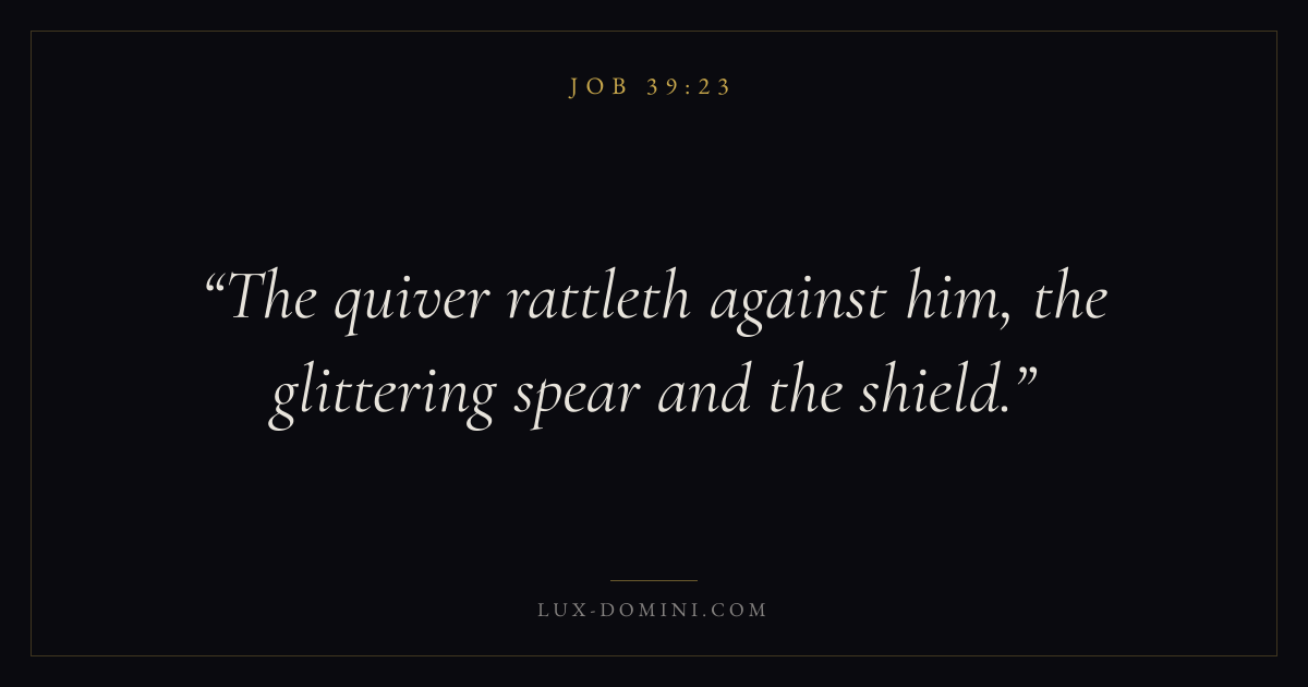Books / Job / Chapter 39 / Verse 23 ← Job 39:22 Job 39:23 Job 39:24 → The quiver rattleth against him, the glittering spear and the shield. Download verse card Share on Twitter Share on Facebook Pin it ✦ Key themes Suffering and trialsWisdomJustice and mercySuffering Read with Job 39:24Job 39:25Romans 8:182 Corinthians 4:17 Related topics Bible verses about suffering and trialsBible verses about wisdomBible verses about justice and mercy ✦ Job Chapter 39 verses V. 1 V. 2 V. 3 V. 4 V. 5 V. 6 V. 7 V. 8 V. 9 V. 10 V. 11 V. 12 V. 13 V. 14 V. 15 V. 16 V. 17 V. 18 V. 19 V. 20 V. 21 V. 22 V. 23 V. 24 V. 25 V. 26 V. 27 V. 28 V. 29 V. 30