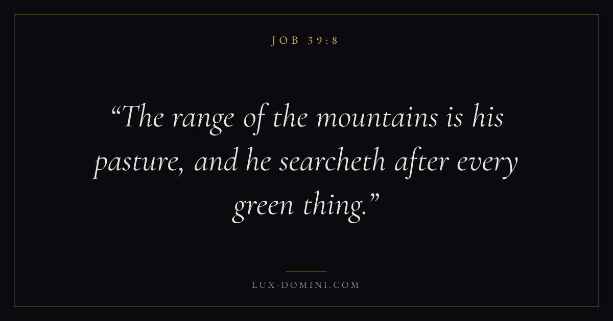 Books / Job / Chapter 39 / Verse 8 ← Job 39:7 Job 39:8 Job 39:9 → The range of the mountains is his pasture, and he searcheth after every green thing. Download verse card Share on Twitter Share on Facebook Pin it ✦ Key themes Suffering and trialsWisdomJustice and mercySuffering Read with Job 39:7Romans 8:182 Corinthians 4:17Proverbs 1:7 Related topics Bible verses about suffering and trialsBible verses about wisdomBible verses about justice and mercy ✦ Job Chapter 39 verses V. 1 V. 2 V. 3 V. 4 V. 5 V. 6 V. 7 V. 8 V. 9 V. 10 V. 11 V. 12 V. 13 V. 14 V. 15 V. 16 V. 17 V. 18 V. 19 V. 20 V. 21 V. 22 V. 23 V. 24 V. 25 V. 26 V. 27 V. 28 V. 29 V. 30