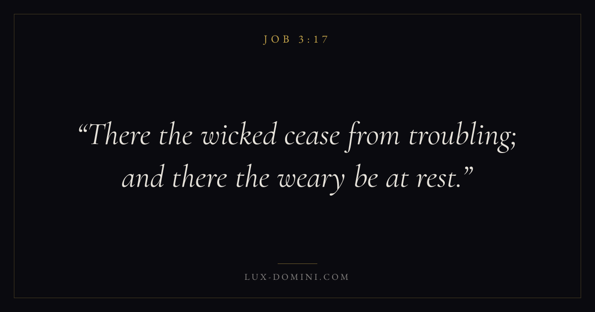 Books / Job / Chapter 3 / Verse 17 ← Job 3:16 Job 3:17 Job 3:18 → There the wicked cease from troubling; and there the weary be at rest. Download verse card Share on Twitter Share on Facebook Pin it ✦ Key themes Suffering and trialsWisdomJustice and mercyPeaceSuffering Read with Job 3:18Job 3:19Romans 8:182 Corinthians 4:17 Related topics Bible verses about suffering and trialsBible verses about wisdomBible verses about justice and mercyBible verses about peace ✦ Job Chapter 3 verses V. 1 V. 2 V. 3 V. 4 V. 5 V. 6 V. 7 V. 8 V. 9 V. 10 V. 11 V. 12 V. 13 V. 14 V. 15 V. 16 V. 17 V. 18 V. 19 V. 20 V. 21 V. 22 V. 23 V. 24 V. 25 V. 26