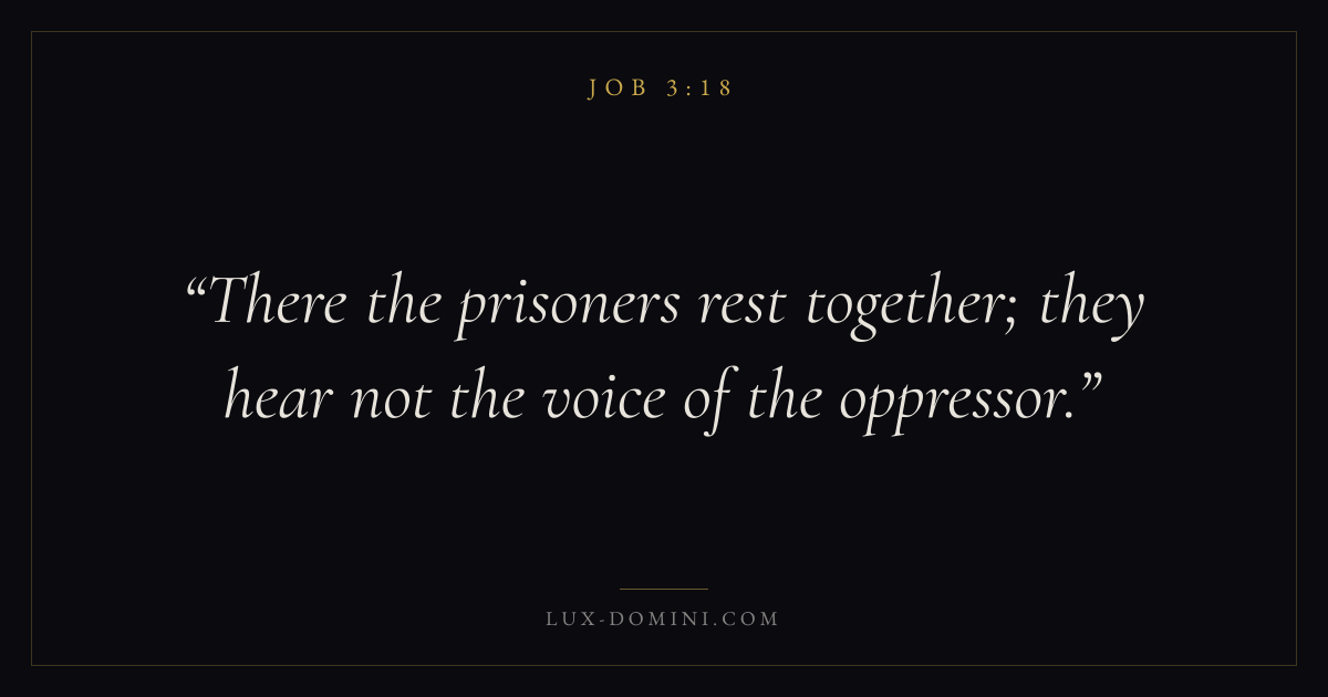 Books / Job / Chapter 3 / Verse 18 ← Job 3:17 Job 3:18 Job 3:19 → There the prisoners rest together; they hear not the voice of the oppressor. Download verse card Share on Twitter Share on Facebook Pin it ✦ Key themes Suffering and trialsWisdomJustice and mercyPeaceSuffering Read with Job 3:17Job 3:19Romans 8:182 Corinthians 4:17 Related topics Bible verses about suffering and trialsBible verses about wisdomBible verses about justice and mercyBible verses about peace ✦ Job Chapter 3 verses V. 1 V. 2 V. 3 V. 4 V. 5 V. 6 V. 7 V. 8 V. 9 V. 10 V. 11 V. 12 V. 13 V. 14 V. 15 V. 16 V. 17 V. 18 V. 19 V. 20 V. 21 V. 22 V. 23 V. 24 V. 25 V. 26