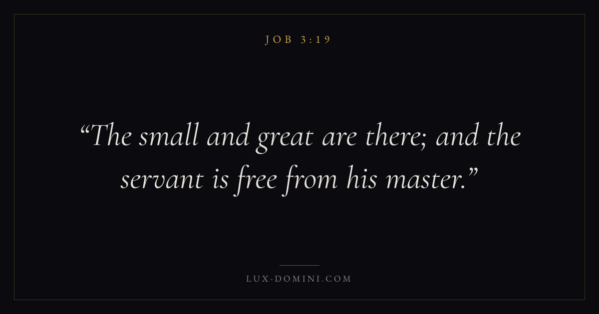 Books / Job / Chapter 3 / Verse 19 ← Job 3:18 Job 3:19 Job 3:20 → The small and great are there; and the servant is free from his master. Download verse card Share on Twitter Share on Facebook Pin it ✦ Key themes Suffering and trialsWisdomJustice and mercySuffering Read with Job 3:17Job 3:18Romans 8:182 Corinthians 4:17 Related topics Bible verses about suffering and trialsBible verses about wisdomBible verses about justice and mercy ✦ Job Chapter 3 verses V. 1 V. 2 V. 3 V. 4 V. 5 V. 6 V. 7 V. 8 V. 9 V. 10 V. 11 V. 12 V. 13 V. 14 V. 15 V. 16 V. 17 V. 18 V. 19 V. 20 V. 21 V. 22 V. 23 V. 24 V. 25 V. 26