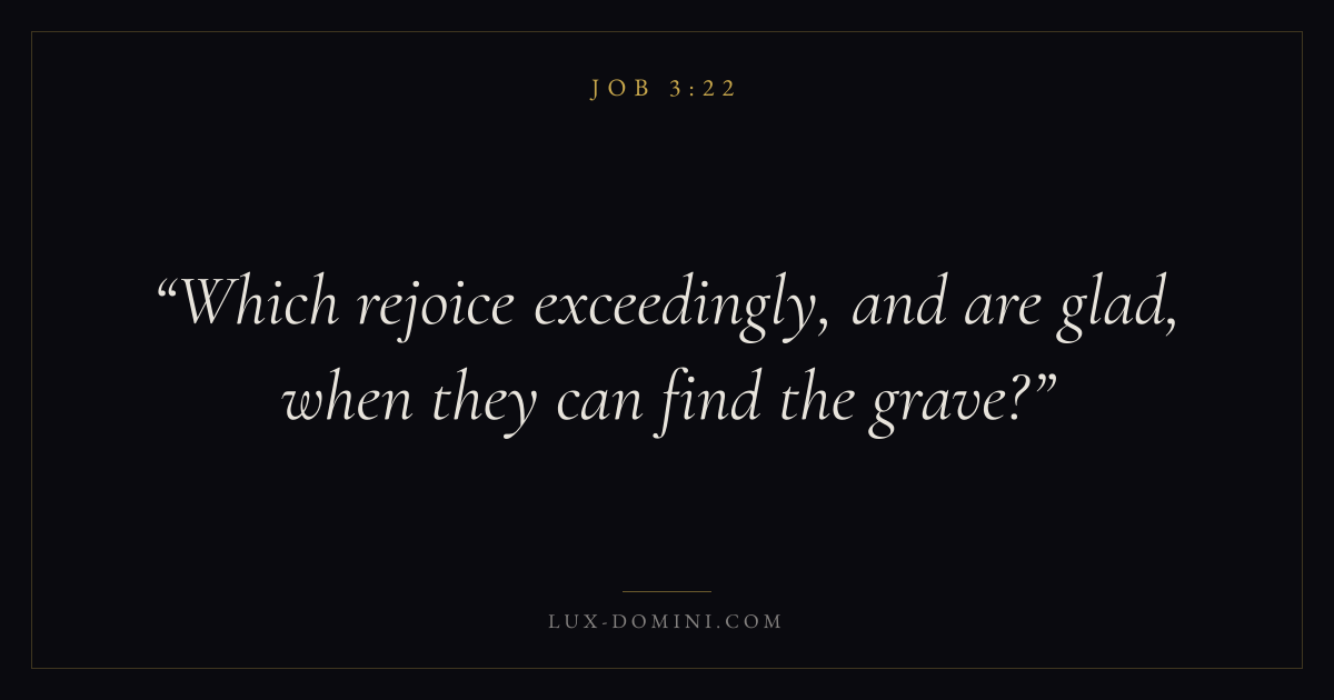 Books / Job / Chapter 3 / Verse 22 ← Job 3:21 Job 3:22 Job 3:23 → Which rejoice exceedingly, and are glad, when they can find the grave? Download verse card Share on Twitter Share on Facebook Pin it ✦ Key themes HopeSuffering and trialsWisdomJustice and mercySuffering Read with Job 3:20Job 3:21Romans 8:24Revelation 21:4 Related topics Bible verses about hopeBible verses about suffering and trialsBible verses about wisdomBible verses about justice and mercy ✦ Job Chapter 3 verses V. 1 V. 2 V. 3 V. 4 V. 5 V. 6 V. 7 V. 8 V. 9 V. 10 V. 11 V. 12 V. 13 V. 14 V. 15 V. 16 V. 17 V. 18 V. 19 V. 20 V. 21 V. 22 V. 23 V. 24 V. 25 V. 26