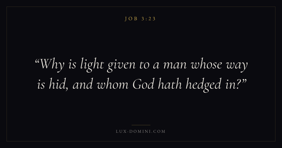 Books / Job / Chapter 3 / Verse 23 ← Job 3:22 Job 3:23 Job 3:24 → Why is light given to a man whose way is hid, and whom God hath hedged in? Download verse card Share on Twitter Share on Facebook Pin it ✦ Key themes HopeSuffering and trialsWisdomJustice and mercySuffering Read with Job 3:24Job 3:25Romans 8:24Revelation 21:4 Related topics Bible verses about hopeBible verses about suffering and trialsBible verses about wisdomBible verses about justice and mercy ✦ Job Chapter 3 verses V. 1 V. 2 V. 3 V. 4 V. 5 V. 6 V. 7 V. 8 V. 9 V. 10 V. 11 V. 12 V. 13 V. 14 V. 15 V. 16 V. 17 V. 18 V. 19 V. 20 V. 21 V. 22 V. 23 V. 24 V. 25 V. 26