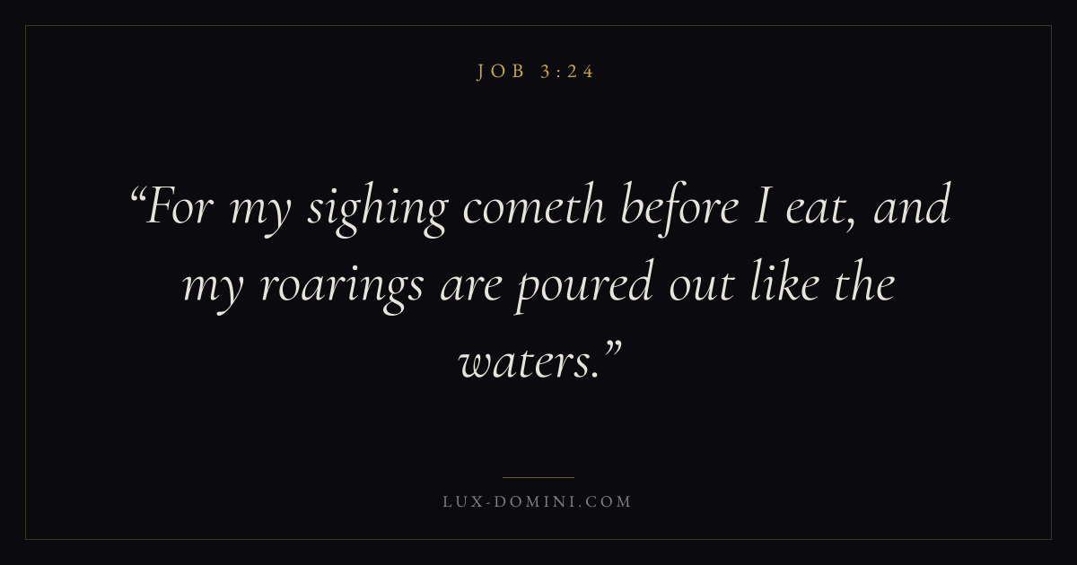Books / Job / Chapter 3 / Verse 24 ← Job 3:23 Job 3:24 Job 3:25 → For my sighing cometh before I eat, and my roarings are poured out like the waters. Download verse card Share on Twitter Share on Facebook Pin it ✦ Key themes HopeSuffering and trialsWisdomJustice and mercySuffering Read with Job 3:23Job 3:25Romans 8:24Revelation 21:4 Related topics Bible verses about hopeBible verses about suffering and trialsBible verses about wisdomBible verses about justice and mercy ✦ Job Chapter 3 verses V. 1 V. 2 V. 3 V. 4 V. 5 V. 6 V. 7 V. 8 V. 9 V. 10 V. 11 V. 12 V. 13 V. 14 V. 15 V. 16 V. 17 V. 18 V. 19 V. 20 V. 21 V. 22 V. 23 V. 24 V. 25 V. 26